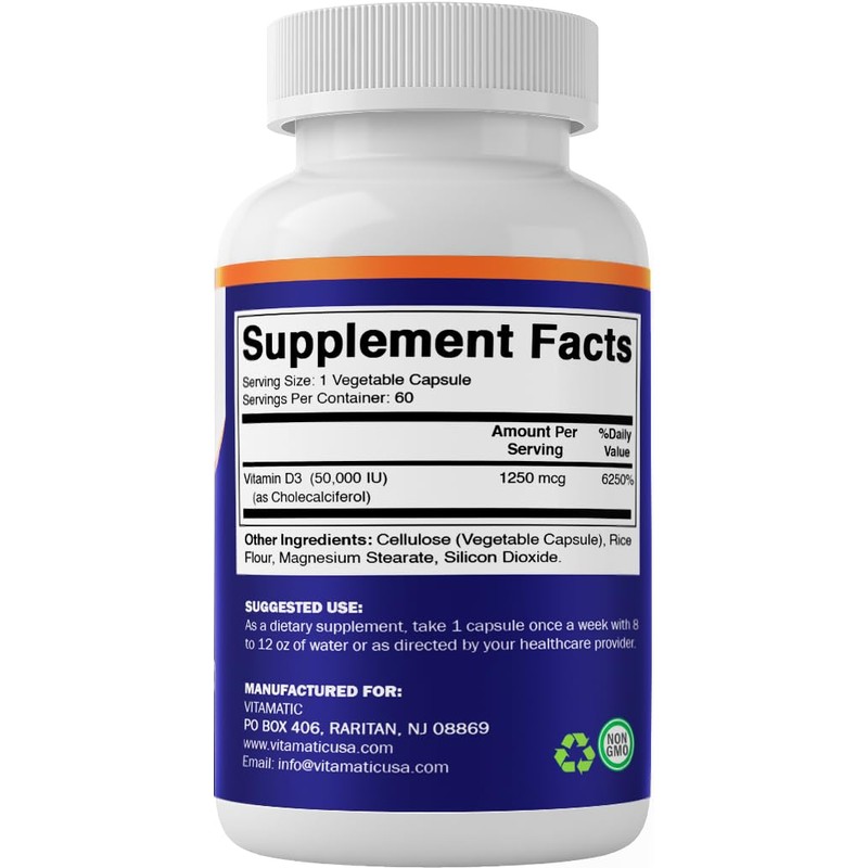 Vitamatic Vitamin D3 50,000 IU (as Cholecalciferol), Once Weekly Dose, 1250 mcg, 60 Veggie Capsules 1 Year Supply, Progressive Formula Helping Vitamin D Deficiencies (60 Count (Pack of 1))