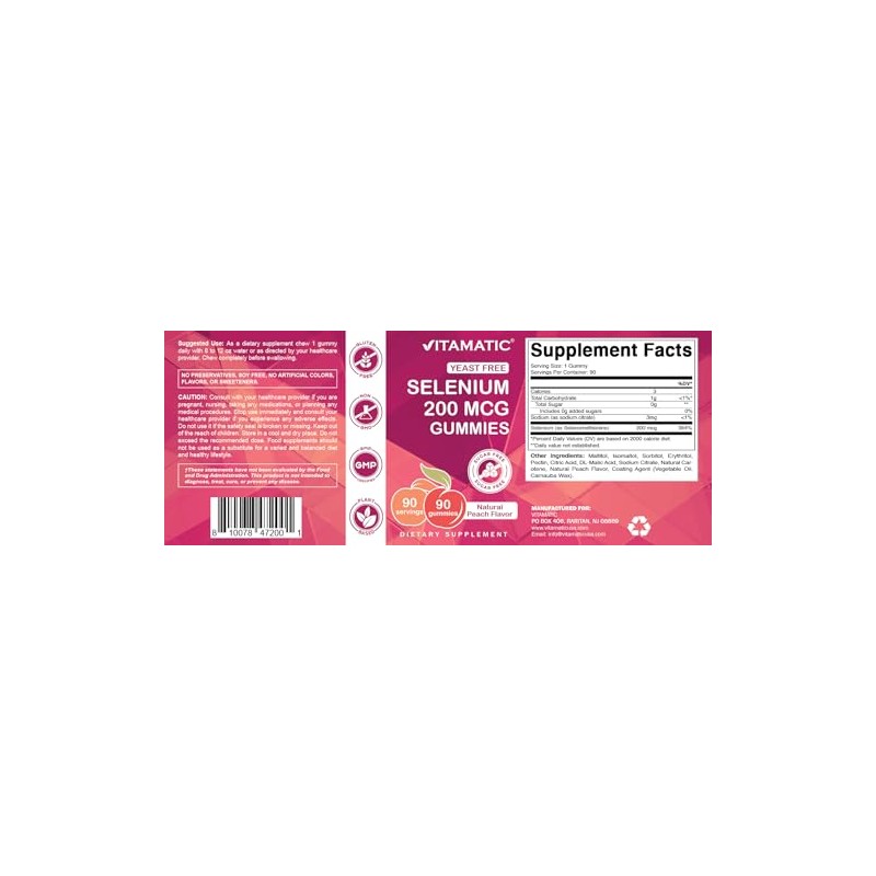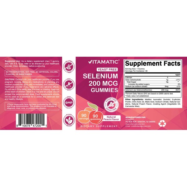 Vitamatic Yeast Free Selenium Gummies 200mcg as Selenomethionine Supplement Essential Trace Mineral with Superior Absorption 90 Pectin Based Gummies - 2 Pack