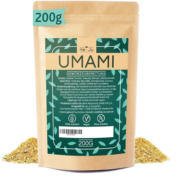 Brand He-Ju Item form Powder Unit count 200.0 gramm Number of items 1 Speciality Gelatine free, Aluminium free packaging Package information Bag Allergen information Contains: Mustard, Celery Flavour Umami Package weight 0.21 Kilograms