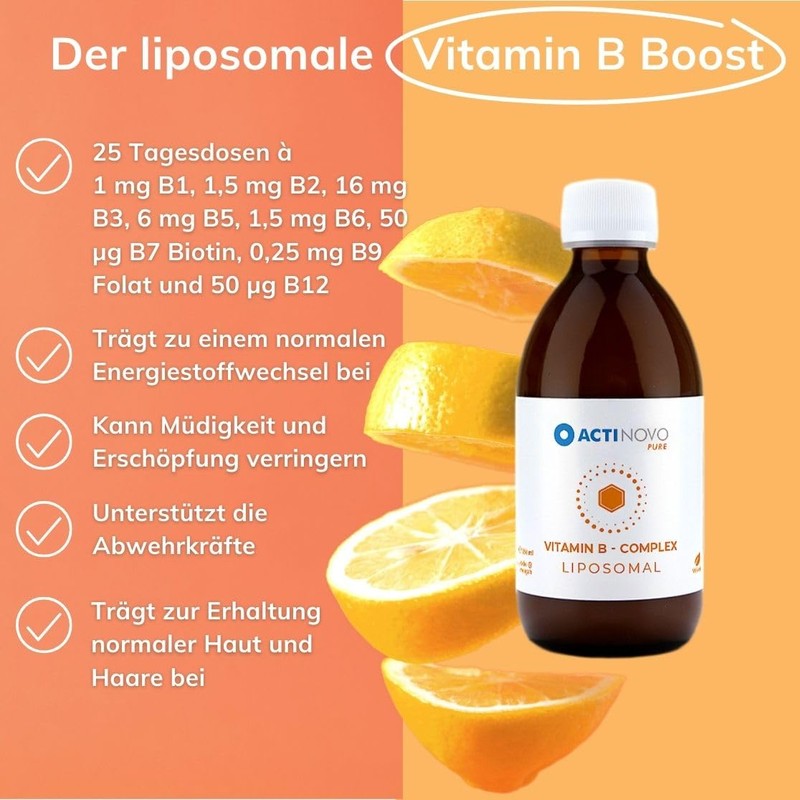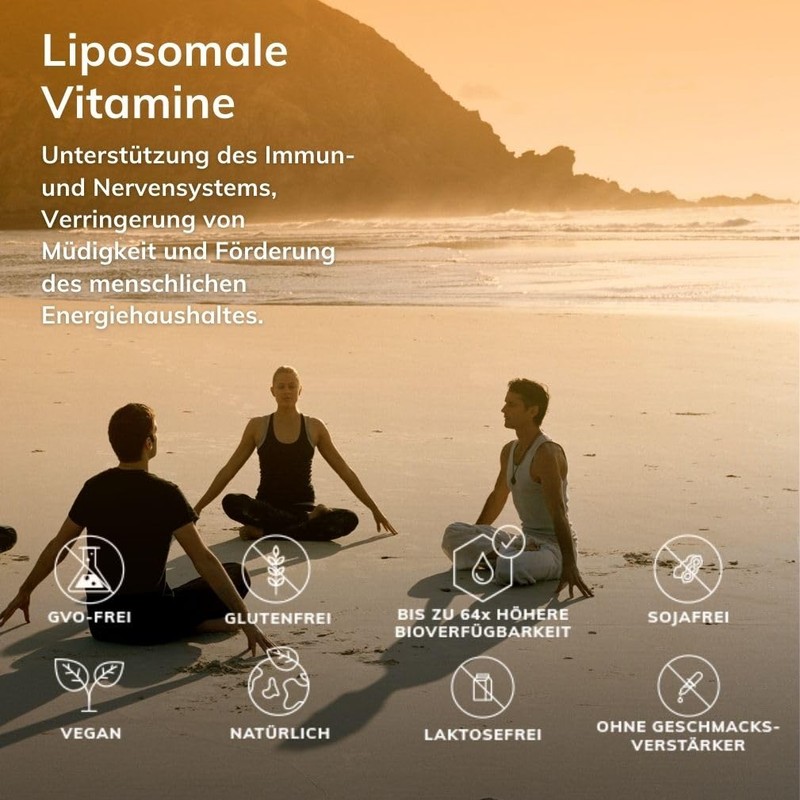 - Optimised bioavailability: liposomes act as a shell for the B vitamins and protect them from the acids and enzymes in the stomach and intestines. Liposomes also increase the amount of B vitamins absorbed into your cells.