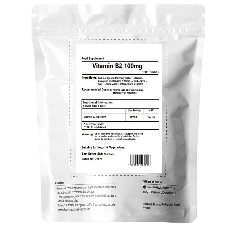 Ingredients: Bulking Agents (Microcrystalline Cellulose, Dicalcium Phosphate), Vitamin B2 (Riboflavin), Anti-Caking Agents (Magnesium stearate).