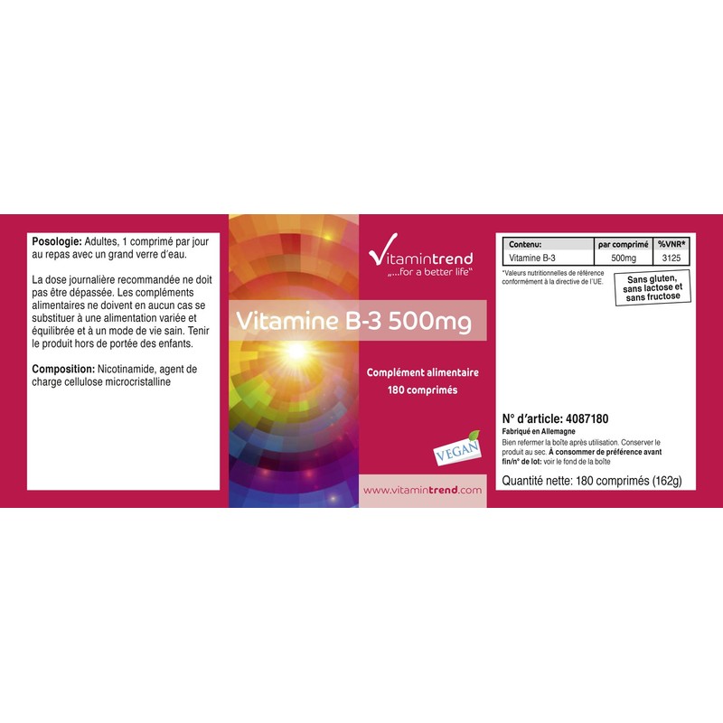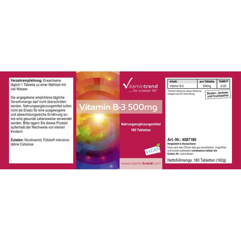 • Vitamin trend German quality. One tablet contains: 500 mg vitamin B3 - recommended daily dose: 1 tablet with a meal with plenty of water - highly dosed active ingredient - excellent value for money. High dose vitamin B3 in the form of nicotinamide