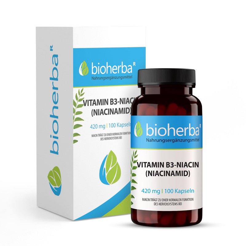 Vitamin B3 Niacinamide Niacin Kapseln 420 mg – Unterstützt Nervensystem & Energie, Verringert Müdigkeit – 100 Niacinamid Kapseln = 100 Tage Vorrat BIOHERBA