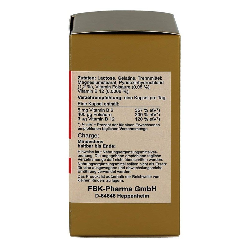 Vitamin B6 + B12 + folic acid capsules (pack size: 120 pieces) is a dietary supplement with vitamin B6 + B12 + folic acid.