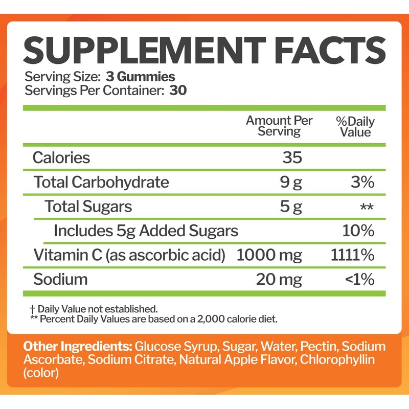 - High-Potency Vitamin C: Each serving of 3 gummies delivers 1,000mg of Vitamin C, providing up to 8 times more than other gummy brands for powerful immune support.