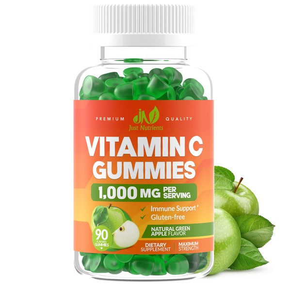 Vitamin C Gummies 1000mg for Adults & Kids - Maximum Strength Chewable Immune Support, Collagen Support - Sour Green Apple Flavor - Gluten Free, Non-GMO, Vegetarian - 90 Gummies (30 Servings)
