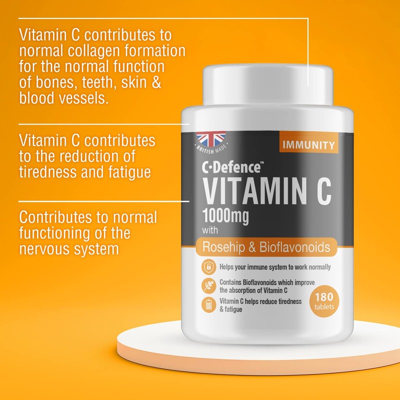 Vitamin C 1000mg with Rosehip and Bioflavonoids -180 Tablets, C-Defence Immunity Tablets- 6 Months Supply