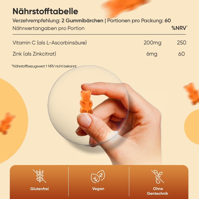 • Vegan and without gelatine – Our vitamin C fruit gums are gluten-free, lactose-free and without preservatives, as well as free from allergens. We ensure that our products are produced according to European standards and under regular quality controls. Our gummy bears with vitamin C are free from animal ingredients and are ideal for vegans and vegetarians.