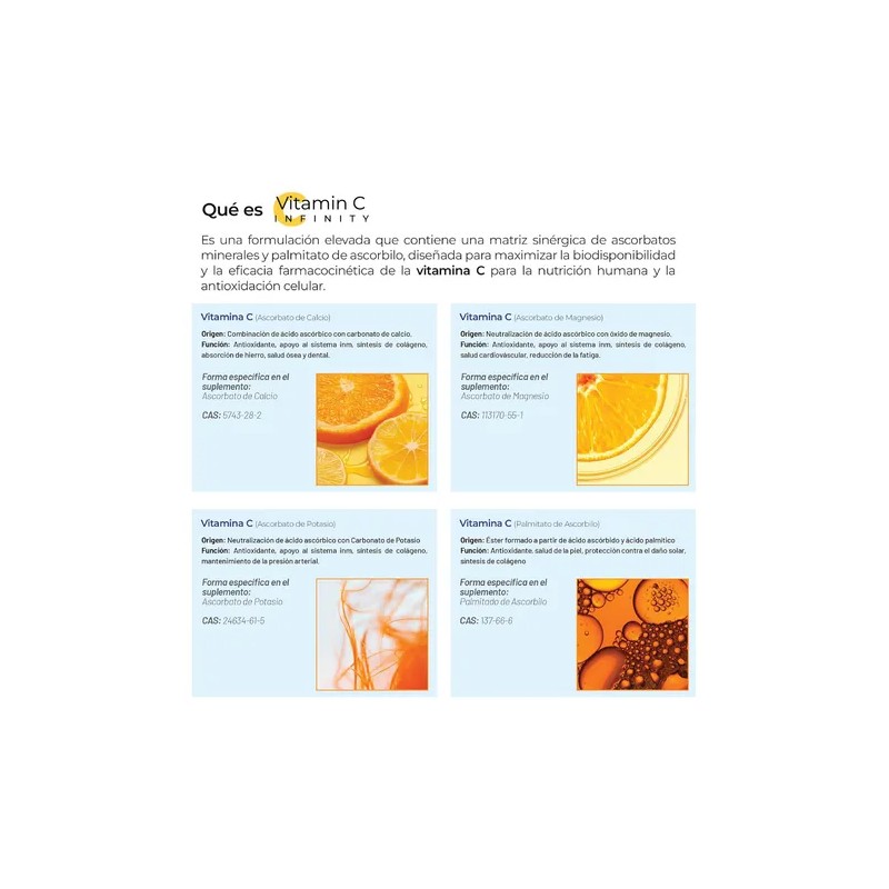 Vitaminas C (5 tipos): Ascorbato de calcio, magnesio, sodio, potasio y palmitato de ascorbilo, que ofrecen una absorción óptima y sostenida.