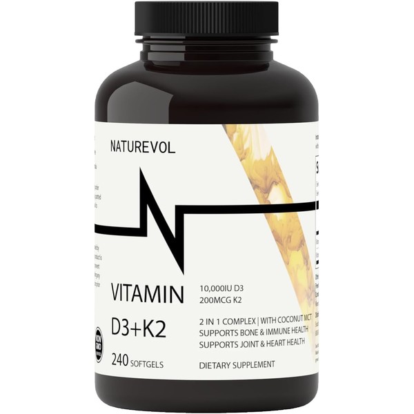 - Extra Strength Formula: Naturevol 2 in 1 Vitamin D3 + K2 with Coconut oil softgels contain 10,000iu D3, 200mcg K2(MK-7) and 300 virgin coconut oil. Formulated for optimal bioavailability, our softgels are designed for easy absorption, ensuring your body effectively utilizes every nutrient for enhanced health benefits.