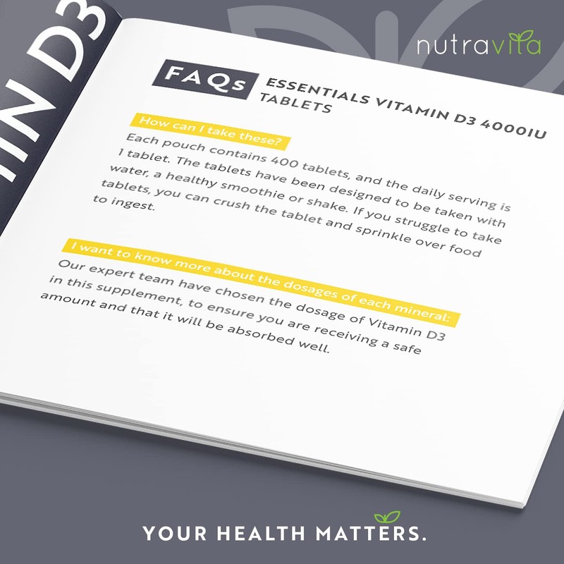 - ✔ WHY NUTRAVITA VITAMIN D3 4000IU TABLETS – Our product provides a maximum strength of 4000iu Vitamin D3, per one convenient easy-to-swallow tablet. Each pouch offers 400 tablets which is just over a one year’s supply, making this product excellent value for money. It is vegetarian friendly and contains no synthetic fillers or binders and is free from allergens such as wheat, gluten, lactose, and nuts.