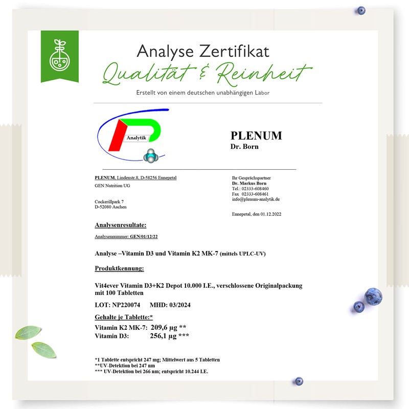 - Laboratory tested quality: independent laboratory-tested active ingredient content (D3, K2 and All Trans content), as well as impurities, such as heavy metals, mould, E. coli, salmonella and other relevant test criteria.