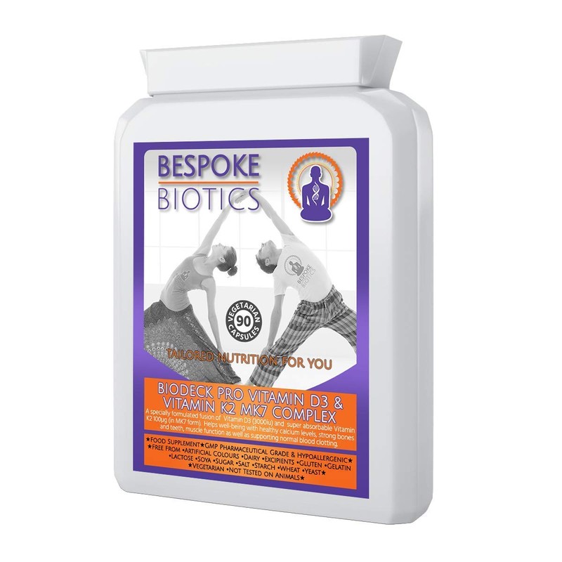 - 👍 HIGH POTENCY - Bespoke Biotics BIODECK PRO Vitamin D3 & Vitamin K2 MK7 COMPLEX supplement has been created to provide an optimum synergistic combination of Vitamin D3 3000 IU and Vitamin K2 100ug MK7 in one convenient daily capsule. Vitamin D contributes to the maintenance of normal bones, muscle function, teeth & immune system and Vitamin K contributes to normal blood clotting and maintenance of bones. We recommend high doses of Vitamin D should not be taken without K2.