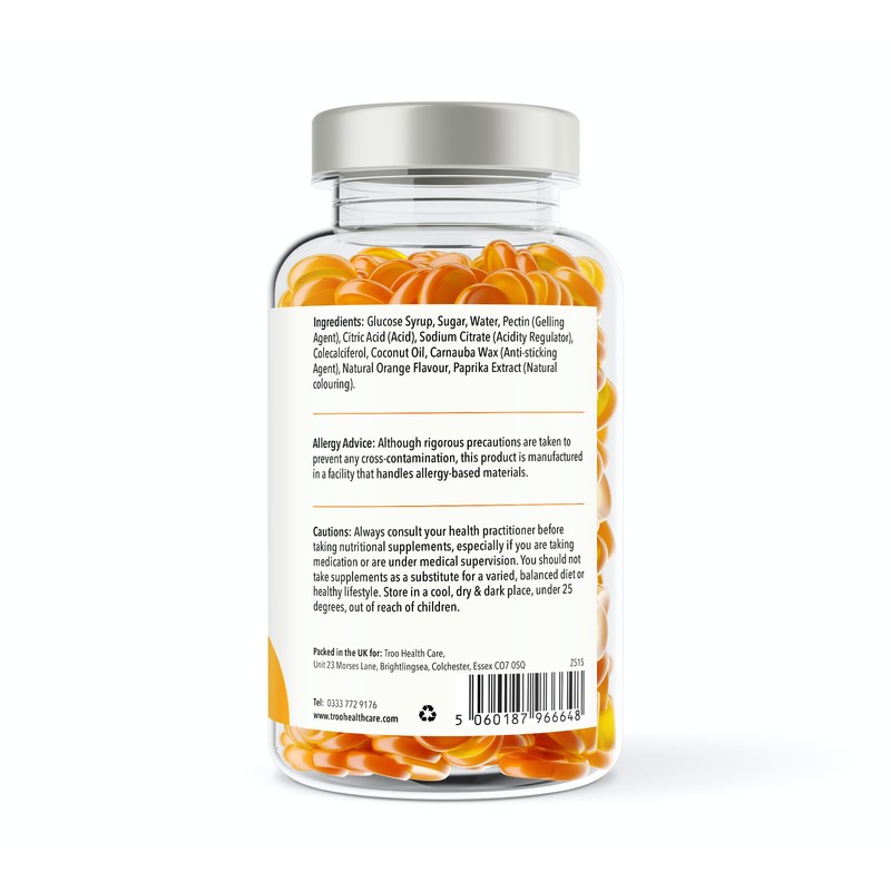 Embrace the power of the sun, now in a delightful gummy format with our high-strength Vitamin D3 gummies, infused with a tantalising natural orange flavour. Each gummy is packed with 4000IU/100μg of vitamin D3, expertly crafted as a convenient daily supplement. Vitamin D3 contributes to the maintenance of normal bones, teeth, muscle function and the function of the immune system..