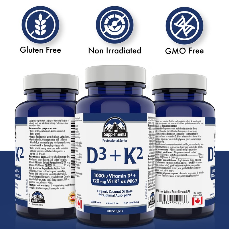 Vitamin D3 and K2 Supplements 180 Softgels - Vit D3 K2 MK7 Vitamin Supplement - D3 K2 Coconut Oil - D3(1000IU-25mcg)+K2(120mcg) - 3rd Party Tested - Formulated & Made in Canada