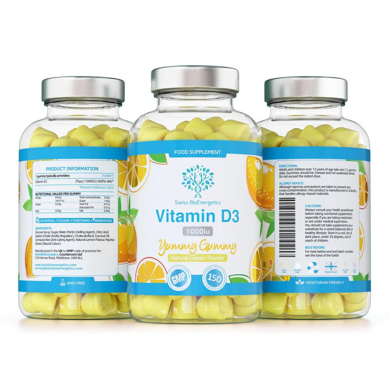 - ✔ HIGHEST POTENCY – Swiss BioEnergetics Vitamin D3 Yummy Gummies provide 25mcg (1000IU) of Vitamin D3 in each gummy. Easy to take and in a super tasty all-natural refreshing lemon flavour. No Artificial Colours, Flavours, Sweeteners or Preservatives
