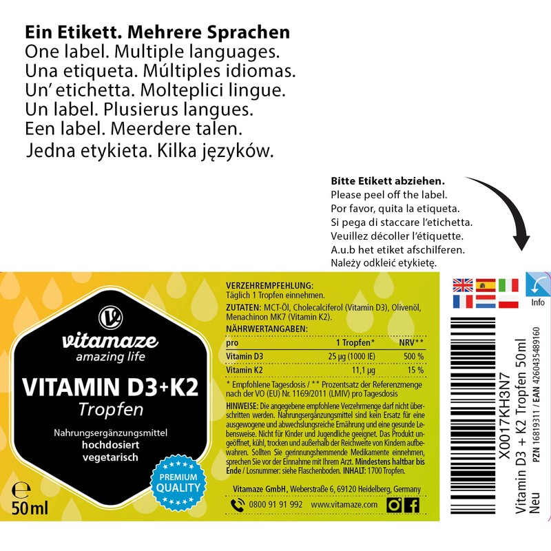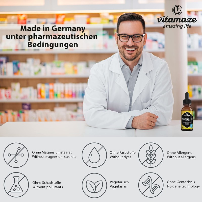 Vitamaze Amazing life: Vitamin D3 + K2 drops. Natural vitamin D3 can be formed by the body or the skin with the help of the sun. However, various situations cause too little sun to come on the skin and a vitamin D3 deficiency is the result. The supplementation of the so-called sun vitamin is now wide-spread. But care should be taken to take additional vitamin K2. The two vitamins have an impact on the mutual bio-availability and effect. 50 ml corresponds to approx. 1700 drops of liquid vitamin D3 + K2 in high-quality MCT oil from coconut and olive oil. Each drop contains 1000 IU (international units) = 25mcg vitamin D3 cholecalciferol and 11.1 mcg vitamin K2 (99% all-trans-MK7). With practical pipette with natural rubber (BPA-free, in light-protected glass bottle for easy dispensing.)