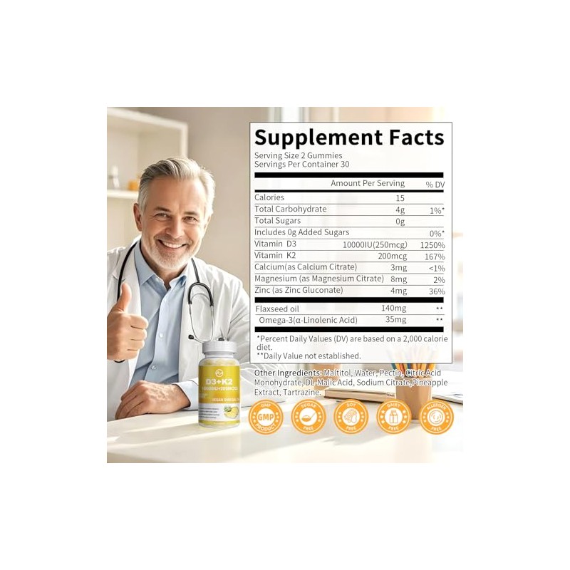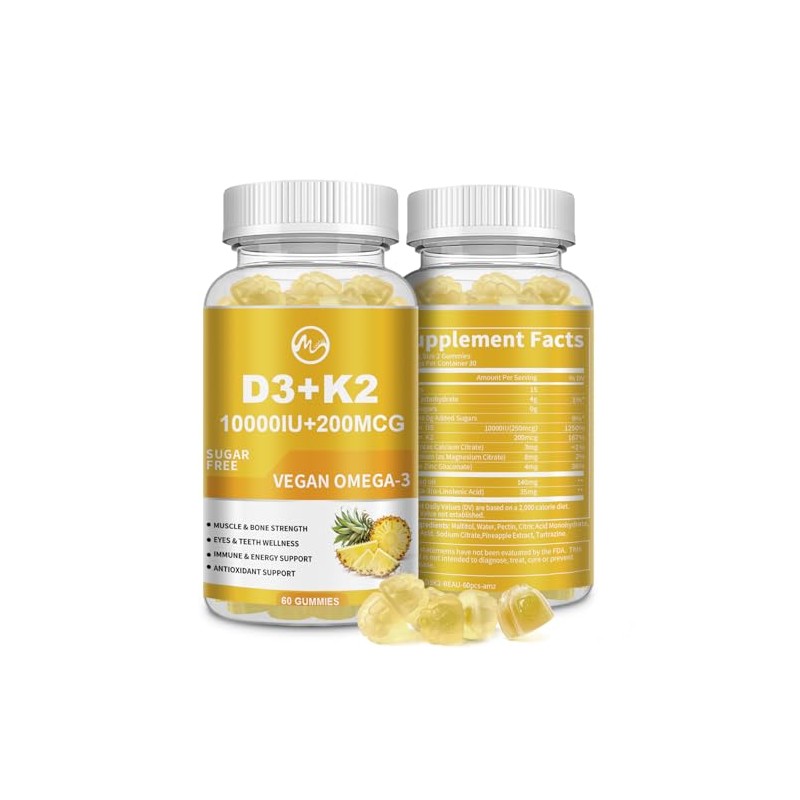 • Vitamin D3 K2 Filled Gummies with Omega-3, Calcium, Magnesium, Zinc, 1 Pack