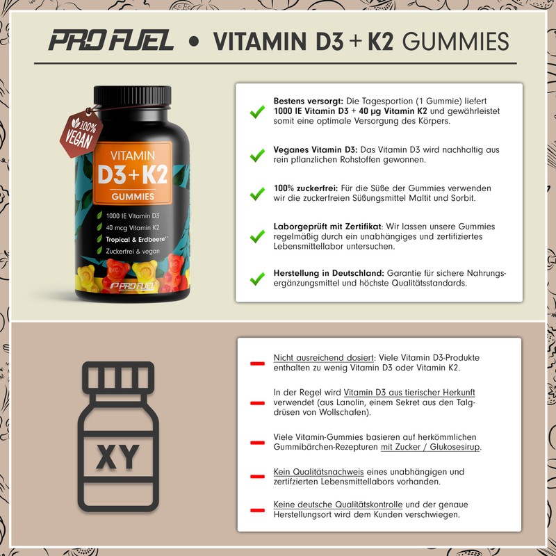 - Vitamin D3 + K2 gums: the vitamin D3 + K2 gummies contain an optimally coordinated combination of active ingredient combination of vegan vitamin D3 and vitamin K2. A vitamin gum provides 1000 IU of vitamin D3 and 40 μg vitamin K2 and thus ensures the best possible supply of the body.