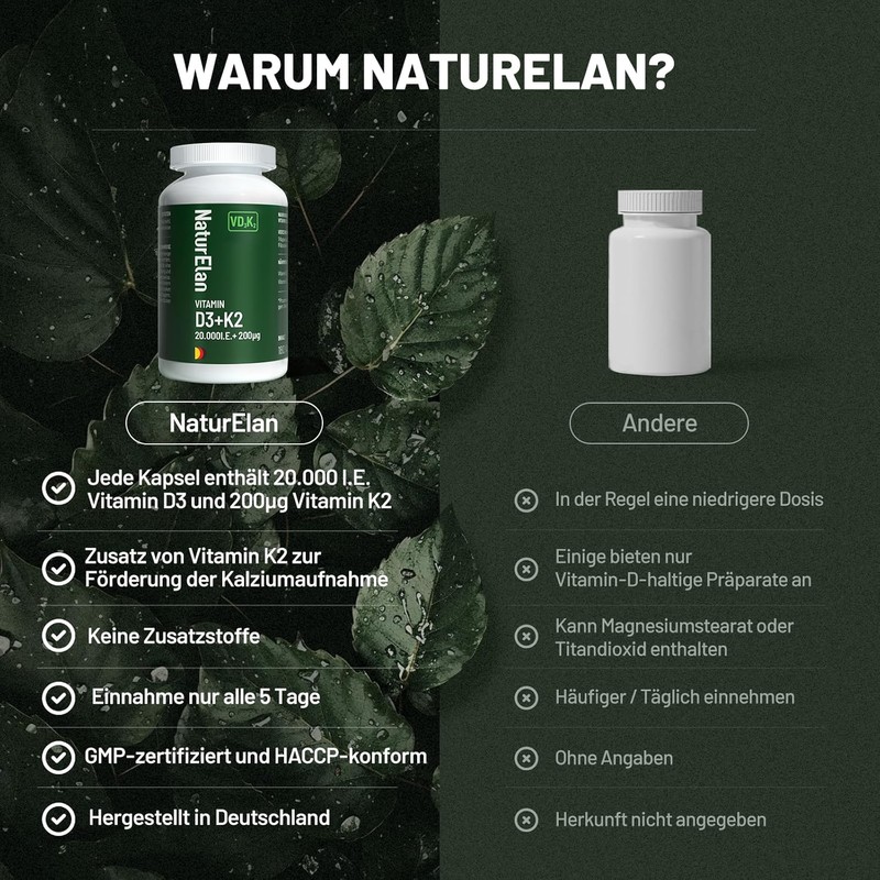 Boost your health with this powerful D3 K2 combination. Each capsule delivers 20,000 IU of vitamin D3 and 200 mcg of vitamin K2 MK7, designed for convenient dosing every 20 days.