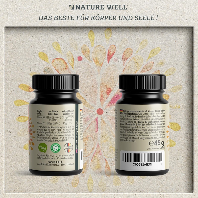The NatureWell Vitamin D3 + K2 makes a valuable contribution to an optimal supply of vitamin D3 in combination with vitamin K2 MK7. One tablet contains 5,000 international units (IE) vitamin D3 and 200 mcg vitamin K2 MK7. Thanks to the depot effect, the body is optimally supplied with a single tablet of vitamin D3 + K2 for 5 days, which corresponds to a daily dose of 1,000 IU vitamin D3 and 40 mcg vitamin K2 MK7.
