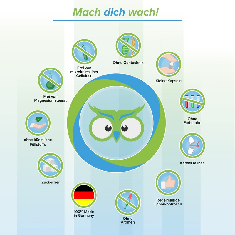 - Hergestellt in Deutschland - ohne künstliche Zusatzstoffe - ohne Magnesiumstearat & mikrokristalline Cellulose - ohne Allergene, laktose- und glutenfrei - ohne Gentechnik - Zertifizierung und Verpackung nach DIN EN ISO / HACCP