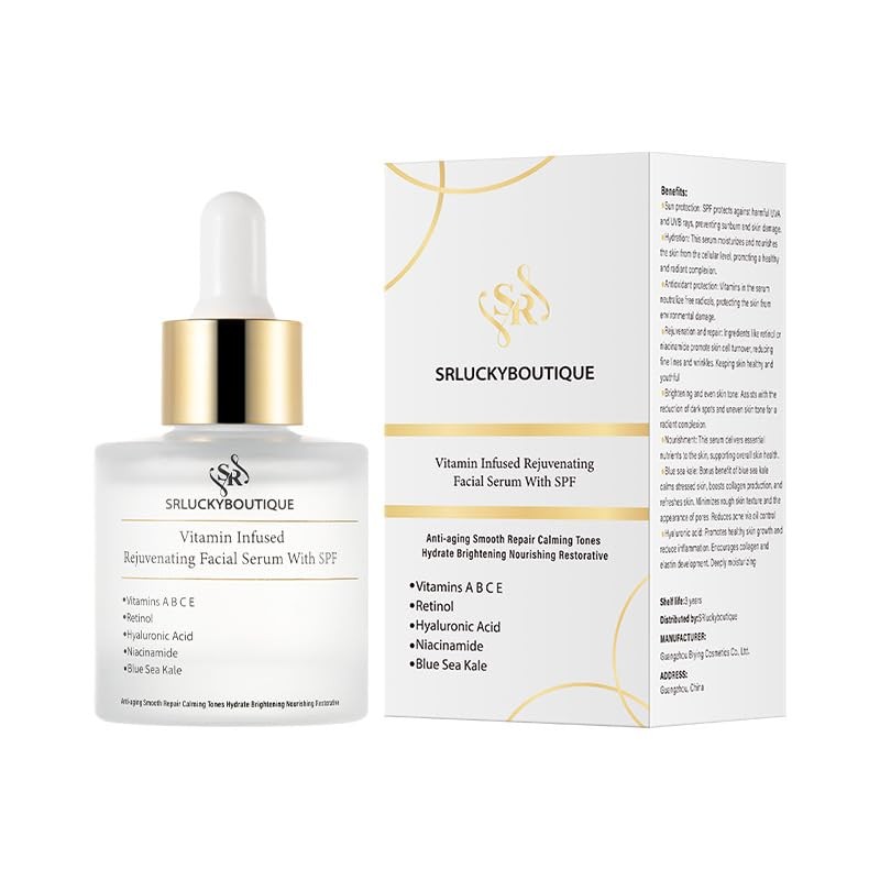 Vitamin Infused Rejuvinating Facial Serum With SPF- Anti aging formula- Brighten Skin- Even skin tone- Advanced hydration- Multi action serum- Vitmain infused- Nourish skin- Collagen and Elastin production- Reduce pores and fine lines- Calm stressed skin