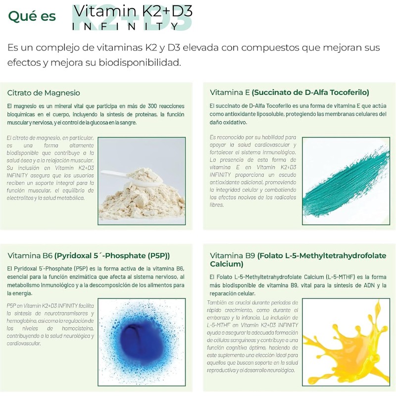 - 💪 Fortalecimiento Óseo: La combinación de vitaminas y minerales en Vitamin K2 + D3 Infinity contribuye significativamente al fortalecimiento de los huesos, lo que es esencial para la prevención de condiciones como la osteoporosis.