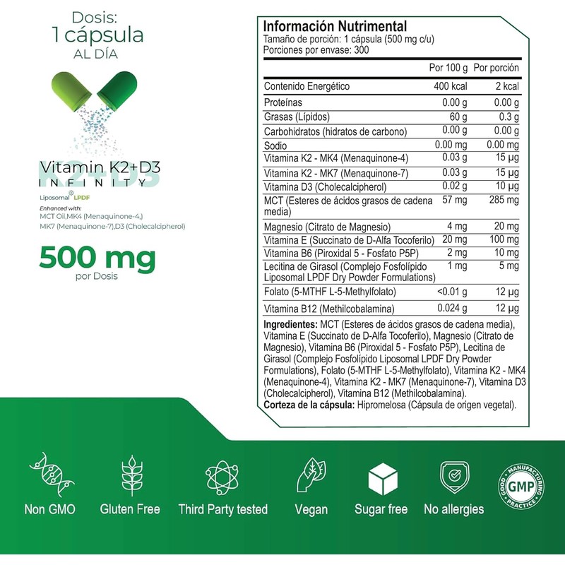 VITAMIN K2+D3 INFINTIY Liposomal 300 capsulas (500mg por porcion) Complejo de Vitaminas K2 (MK4 y MK7) + Vitamina D3 con MCT OIL y Folato, by Eternal Nutrition - Ingredientes Naturales Premium de USA