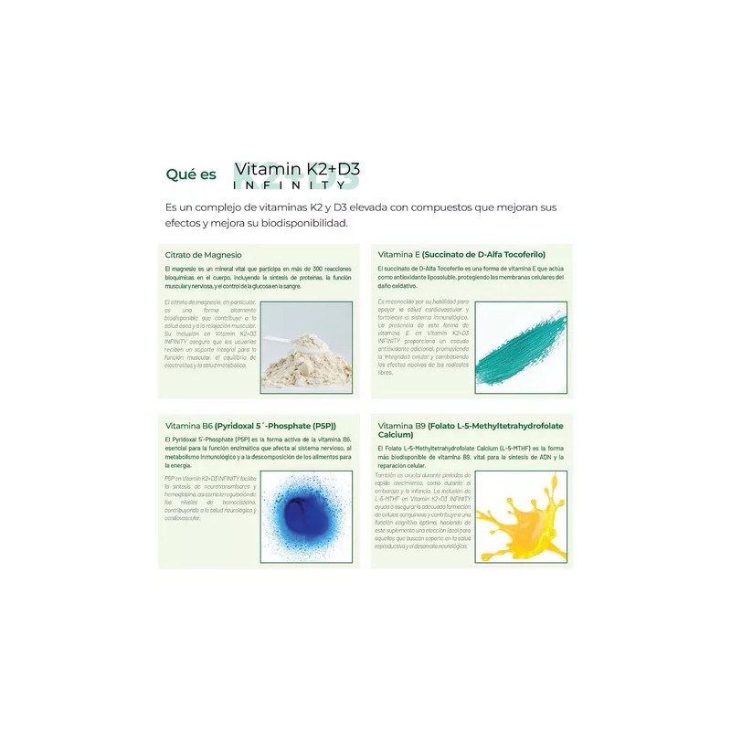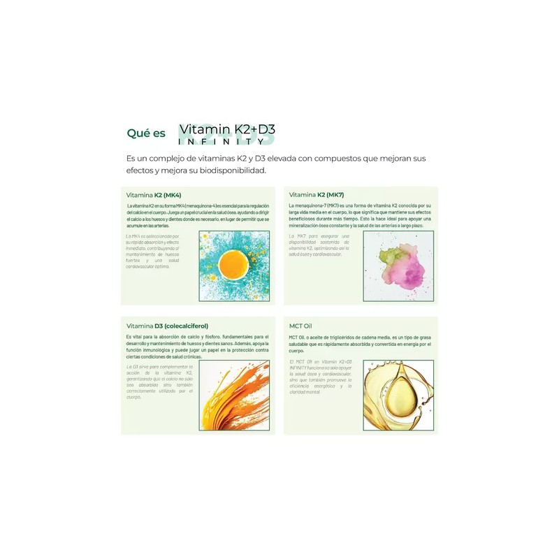 Fortalecimiento Óseo: La combinación de vitaminas y minerales en Vitamin K2 + D3 Infinity contribuye significativamente al fortalecimiento de los huesos, lo que es esencial para la prevención de condiciones como la osteoporosis.