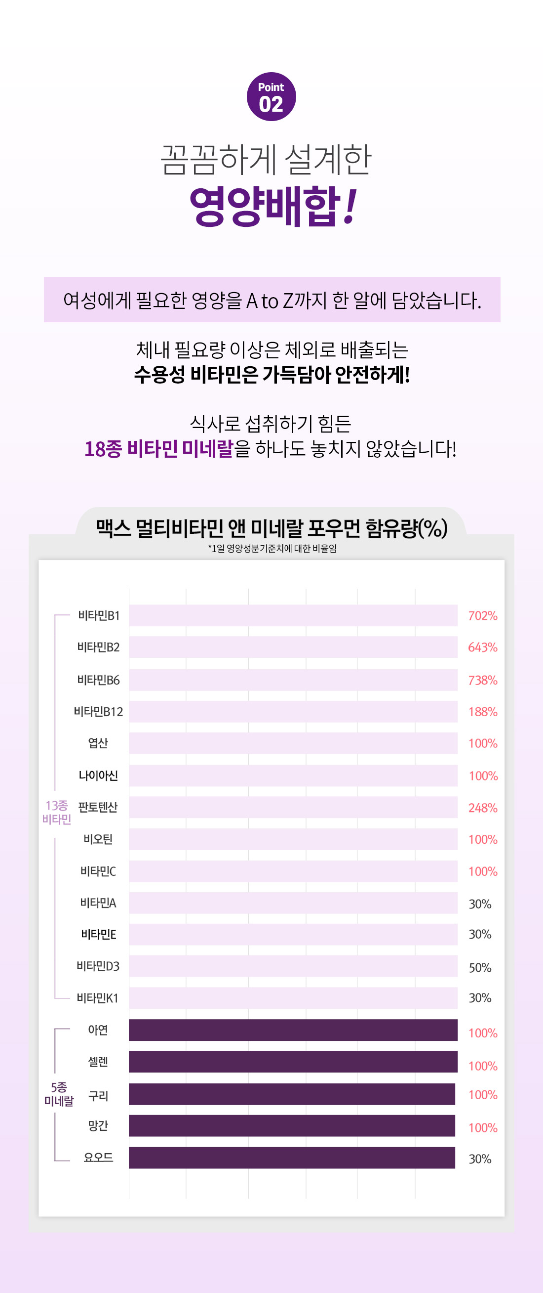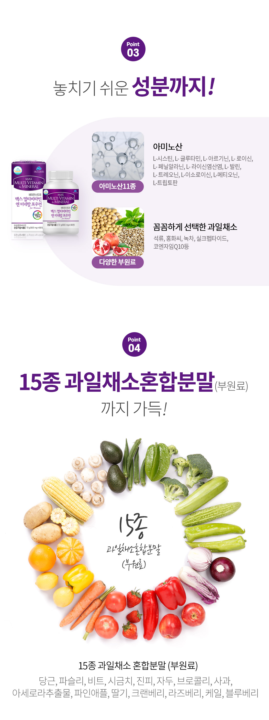 • 원(재)료명 및 함량: 비타민C, 건조효모(셀렌), 비타민E분말(DL-α-토코 페릴아세테이트, 변성전분, 포도당시럽분말, 이산화규소), 니코틴산아미드, 판토텐산칼슘, 비타민B6염산염, 비타민B1염산염, 산화아연, 비타민B2, 비타민B12혼합제제(비타민B12, 말토덱스트린, 구연산삼나트륨, 구연산), 황산망간, 비타민D3분말(비타민D3, 아라비아검, 자당, 옥수수전분, 가공유지, 이산화규소, DL-α-토코페롤), 황산동, 분말비타민A(비타민A아세테이트, 포도당시럽분말, 아라비아검, 옥수수전분, DL-α-토코페롤), 비타민K혼합제제(비타민K1, 아라비아검, 수크로오스), 엽산, 요오드칼륨, 비오틴, 결정셀룰로스, 타피오카전분(산화전분, 말토덱스트린), 석류농축액분말(석류농축액, 덱스트린), 해조분말, L-시스틴, 홍화씨추출물분말, 이노시톨, 이산화규소, L-글루타민, 클로렐라, L-라이신염산염, L-아르지닌, 히드록시프로필메틸셀룰로스, 스테아린산마그네슘, 녹차추출물분말, 과일채소혼합분말, 마카추출물분말, 아미노산혼합분말(L-글루타민, L-로이신, L-페닐알라닌, L-라이신염산염, L-발린, L-트레오닌, L-이소로이신, L-메티오닌, L-트립토판), 건조효모(크롬), 실크펩타이드, 무수구연산, 푸마르산제일철, 산화마그네슘, 대두추출물분말, 코엔자임Q10 [대두함유]
