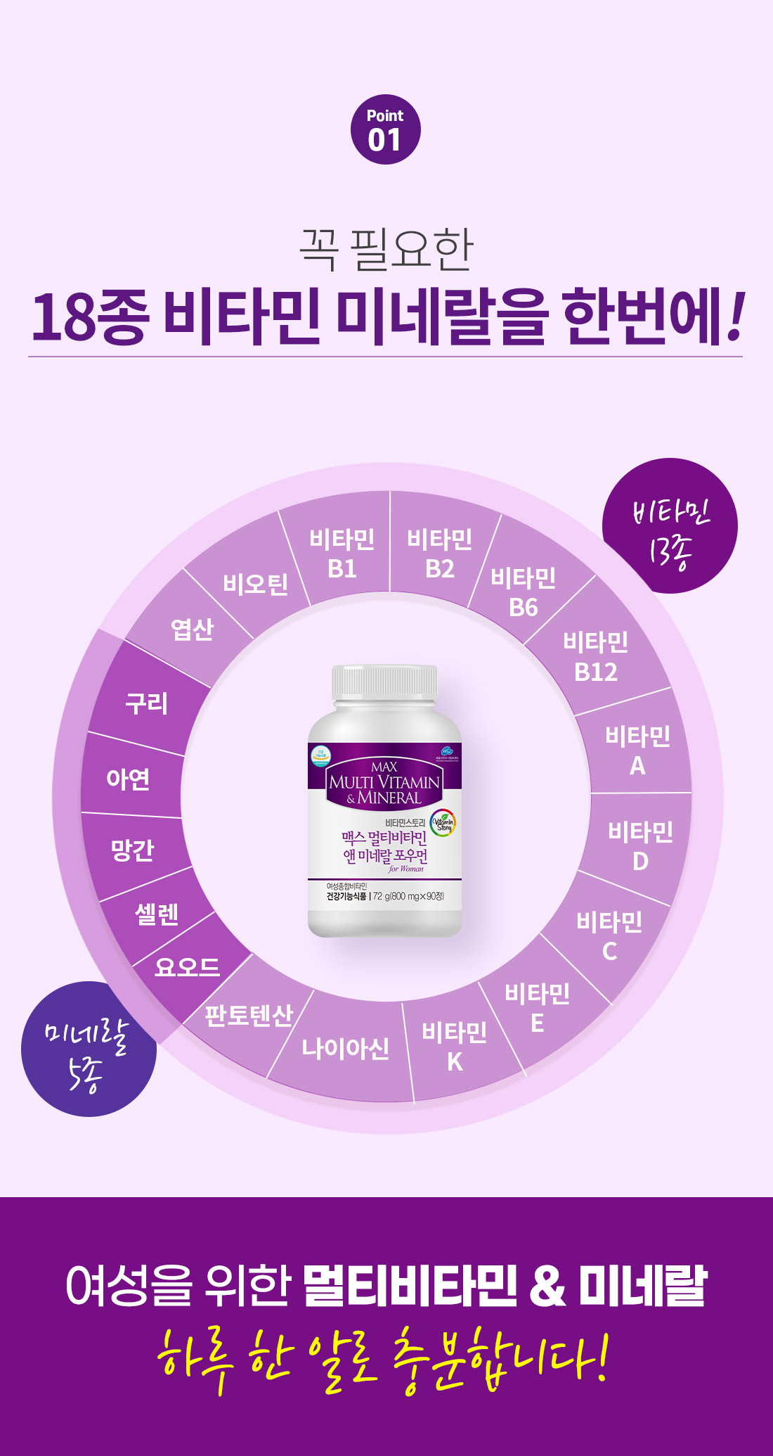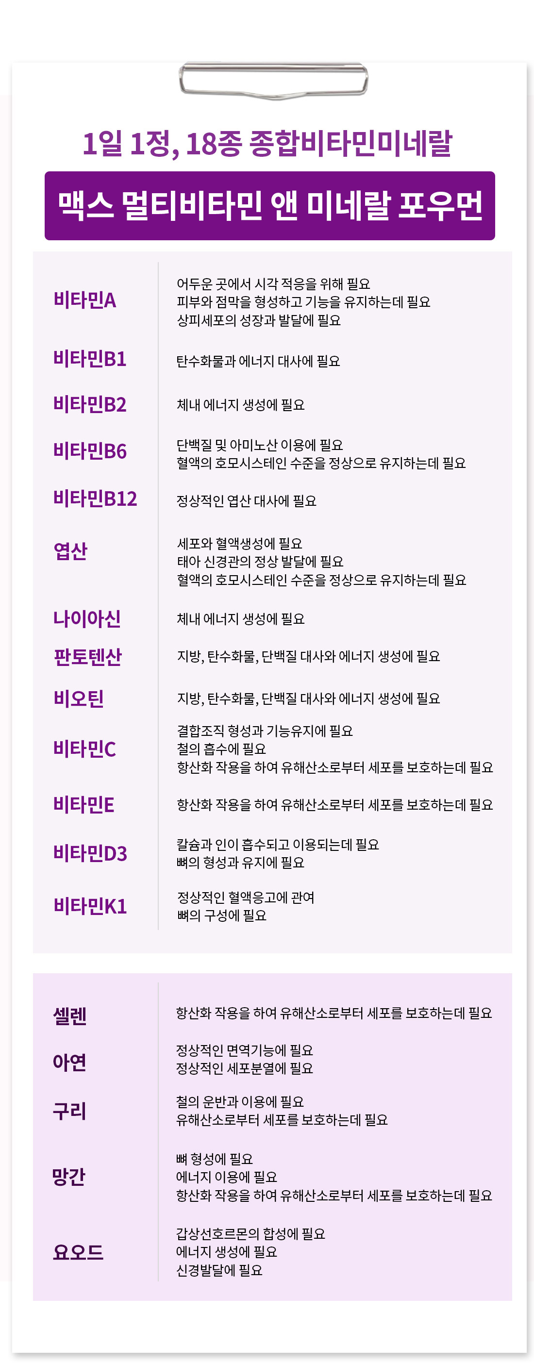 • 기능정보: [비타민A] 어두운 곳에서 시각 적응을 위해 필요 / 피부와 점막을 형성하고 기능을 유지하는데 필요 / 상피세포의 성장과 발달에 필요 [비타민B1] 탄수화물과 에너지 대사에 필요 [비타민B2] ] 체내 에너지 생성에 필요 [비타민B6] 단백질 및 아미노산 이용에 필요 / 혈액의 호모시스테인 수준을 정상으로 유지하는데 필요 [비타민B12] 정상적인 엽산 대사에 필요 [엽산] 세포와 혈액생성에 필요 / 태아 신경관의 정상 발달에 필요 / 혈액의 호모시스테인 수준을 정상으로 유지하는데 필요 [나이아신] 체내 에너지 생성에 필요 [판토텐산] 지방, 탄수화물, 단백질 대사와 에너지 생성에 필요 [비오틴] 지방, 탄수화물, 단백질대사와 에너지 생성에 필요 [비타민C] 결합조직 형성과 기능유지에 필요 / 철의 흡수에 필요 /유해산소로부터 세포를 보호하는데 필요 [비타민E] 유해산소로부터 세포를 보호하는데 필요 [비타민D] 칼슘과 인이 흡수되고 이용되는데 필요 / 뼈의 형성과 유지에 필요 / 골다공증발생 위험감소에 도움을 줌 [비타민K] 정상적인 혈액응고에 필요 / 뼈의 구성에 필요 [아연] 정상적인 면역기능에 필요 / 정상적인 세포분열에 필요 [셀렌] 유해산소로부터 세포를 보호하는데 필요 [구리] 철의 운반과 이용에 필요 / 유해산소로부터 세포를 보호하는데 필요 [망간] 뼈 형성에 필요 / 에너지 이용에 필요 / 유해산소로부터 세포를 보호하는데 필요 [요오드] 갑상선 호르몬의 합성에 필요 / 에너지 생성에 필요 / 신경발달에 필요