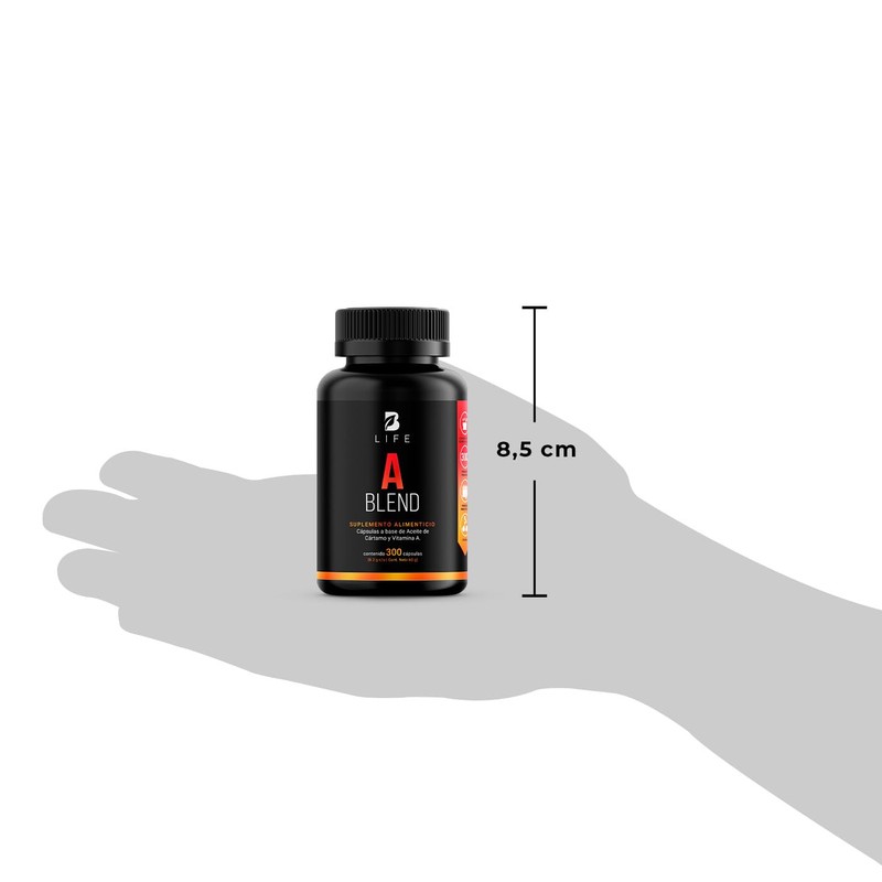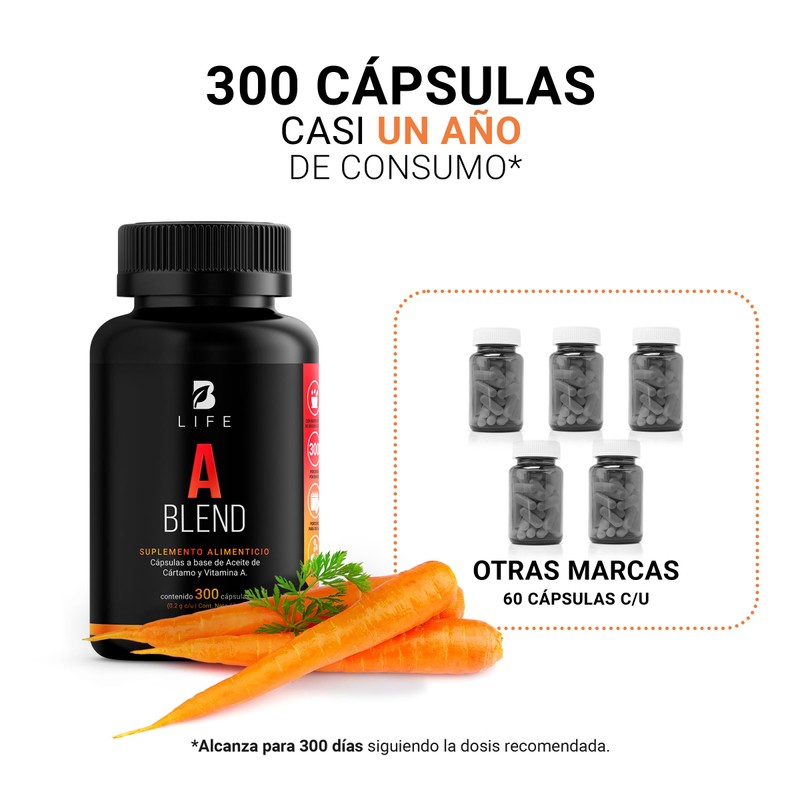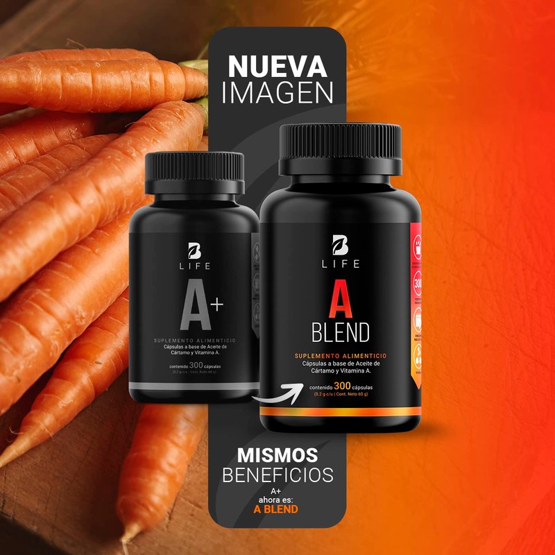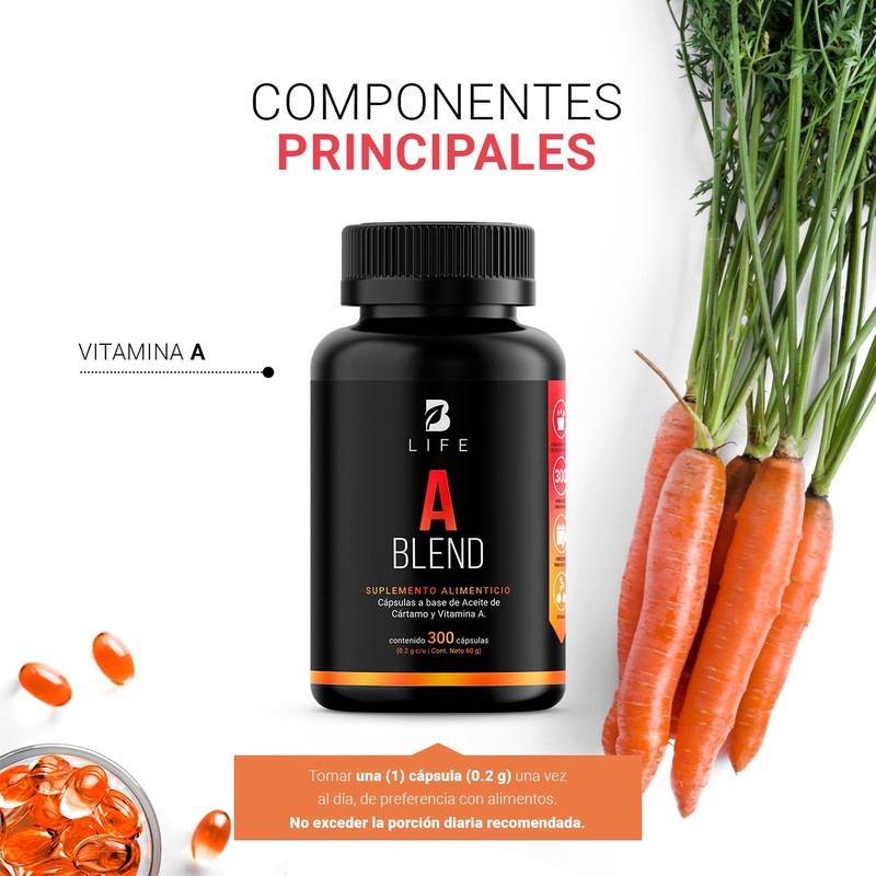 - A Blend es un suplemento alimenticio con 300 cápsulas a base de Vitamina A y Aceite de Cártamo (rico en omega 6).