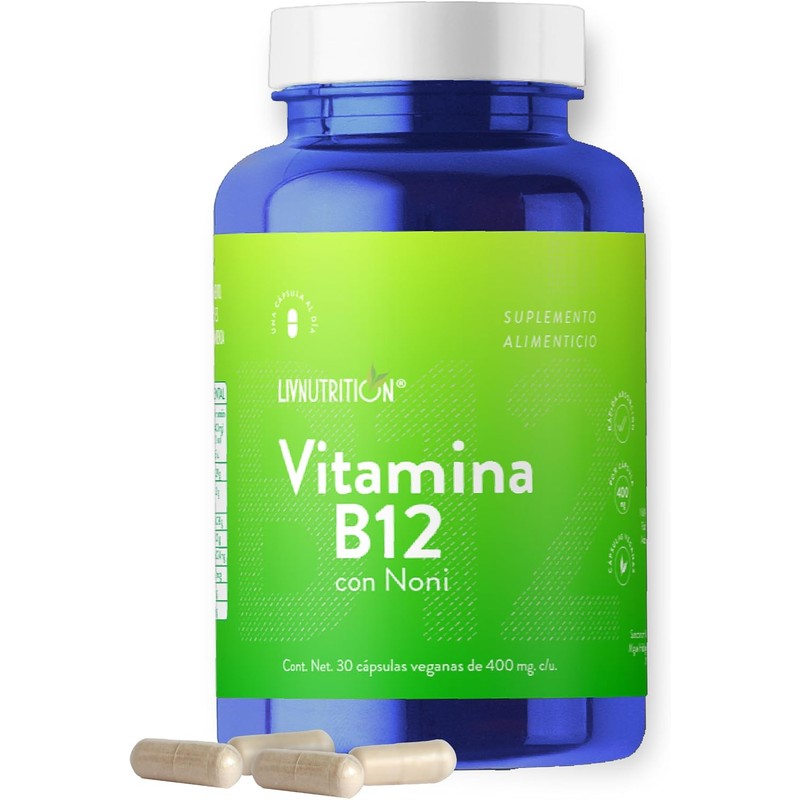 Vitamina B12 y Noni en polvo con 30 Cápsulas de 400mg | 1 mes de rendimiento | 100% Natural, Vegano y Sin gluten | Suplemento Alimenticio | Multivitaminico Hombre y Mujer | LIV NUTRITION
