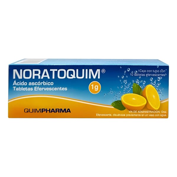 La Vitamina C 1 G de Noratoquim se presenta en una caja con 10 tabletas efervescentes, cada una con una dosis de 1 gramo de ácido ascórbico (vitamina C). Estas tabletas están diseñadas para disolverse en agua, lo que facilita su consumo y permite una rápida absorción en el organismo.
