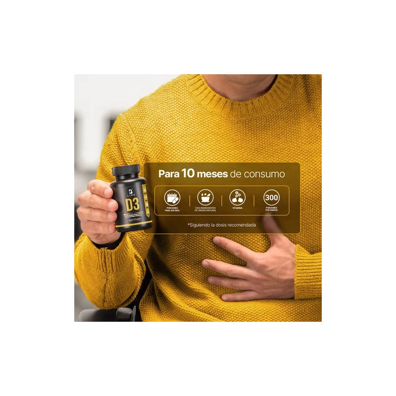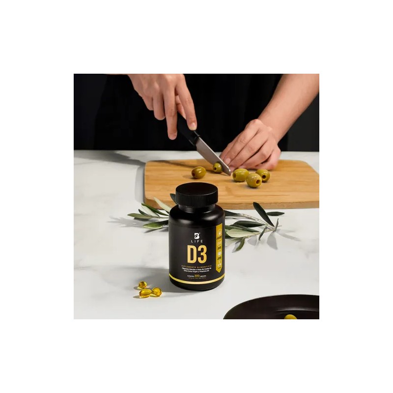 D3+ B Life es tu aliado para la vitalidad. Cada cápsula de 200 mg contiene una mezcla de Vitamina D3 (5000 UI) enriquecida con Aceite de Oliva Extra Virgen, que no solo mejora la absorción sino que también potencia sus beneficios. Una combinación exclusiva de componentes sinérgicos que se distingue de otras presentaciones. El envase incluye 300 cápsulas.