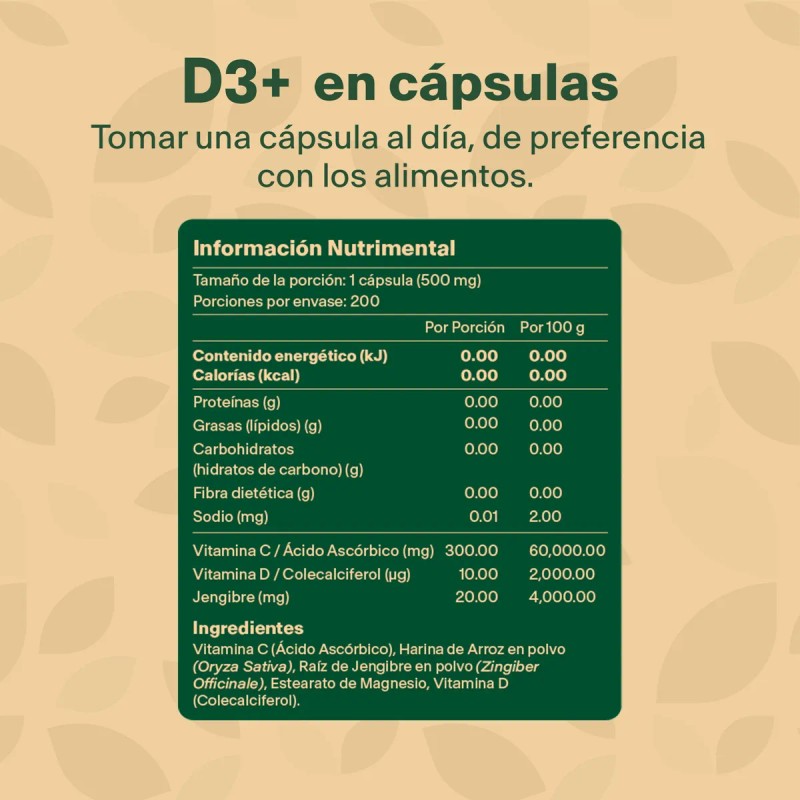 Ingredientes: Vitamina C (Ácido ascórbico), Vitamina D (Colecalciferol), Jengibre (Zingiber officinale).