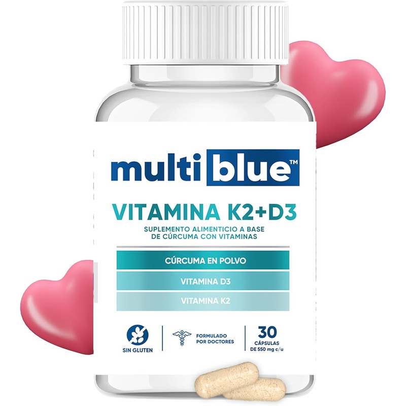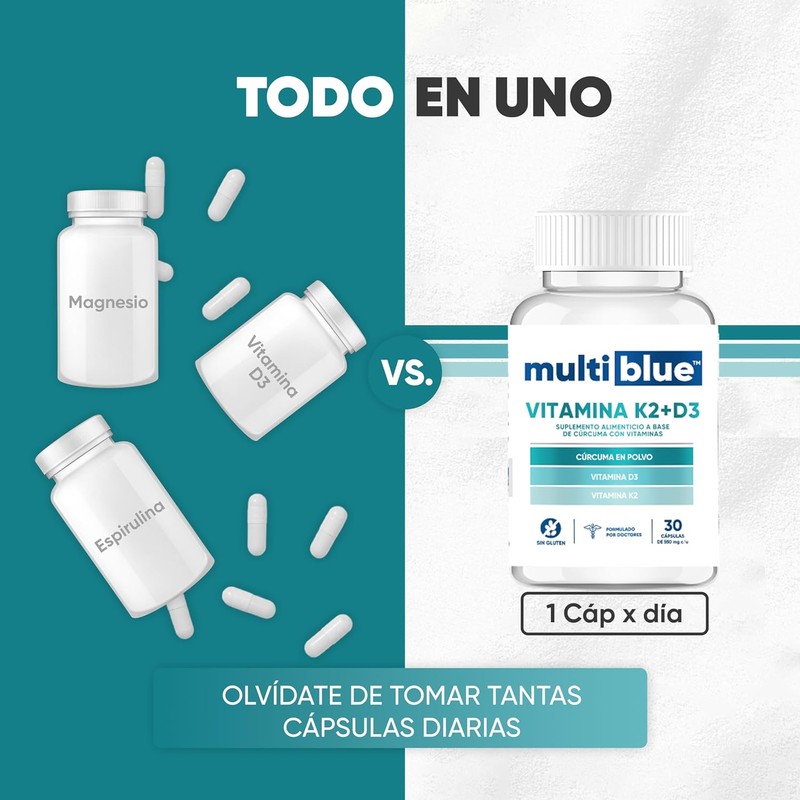 Vitamina D3 K2 30 Cápsulas de 550mg | Combinación Óptima de Vitaminas con Cúrcuma | 100% Natural, Sin Gluten, Keto Friendly, Vegano | Multivitaminico Soporte Nutricional Avanzado | MULTIBLUE