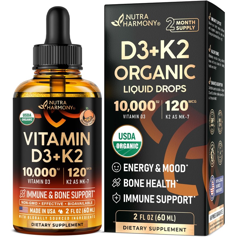 - Sobre este artículo Vitamina líquida orgánica USDA D3 10,000 UI + K2 120 mcg – el sol en cada gota! Obtén tu dosis diaria de sol y fuerza con nuestro líquido D3+K2 de alta potencia. Esta poderosa mezcla dúo apoya huesos fuertes, un sistema inmunológico resistente y vitalidad durante todo el día, todo con un sabor a naranja deliciosamente brillante. Altamente biodisponible y 2 veces más fuerza: cada porción ofrece 10,000 UI de vitamina D3 (1250% DV) para ayudar a satisfacer tus necesidades diarias, mientras que la vitamina K2 en forma de MK