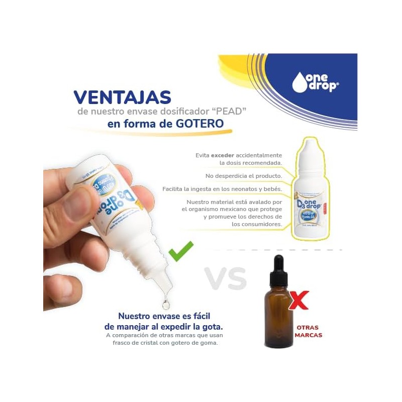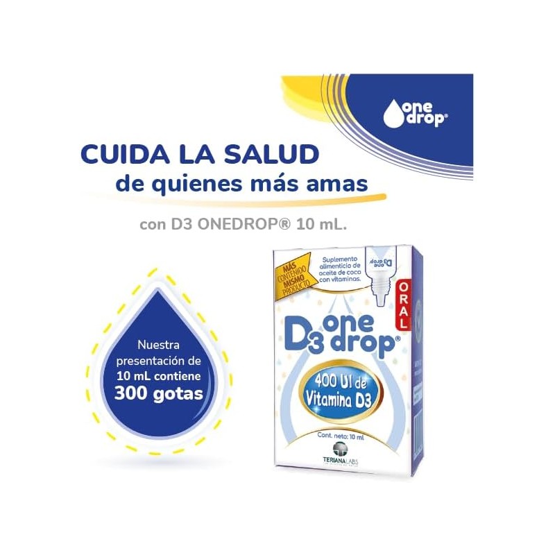 La Vitamina D3 ONEDROP es un suplemento en gotas diseñado para apoyar la salud ósea, el sistema inmunológico y el desarrollo general. Su fórmula líquida facilita la absorción y dosificación, proporcionando 400 UI de vitamina D3 por porción. Ideal para niños y adultos que necesitan reforzar sus niveles de esta vitamina esencial.