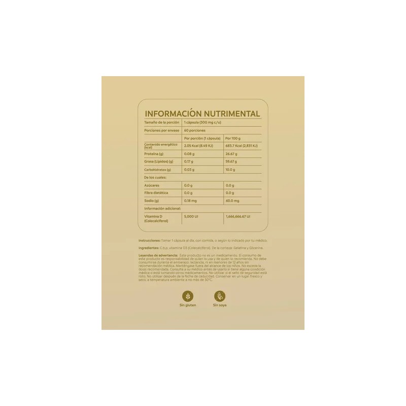 La Vitamina D3 Support de NUTRIADN es un suplemento esencial para quienes buscan fortalecer su salud ósea y mejorar su bienestar general. Cada cápsula contiene 300 mg de Vitamina D3, proporcionando 5000 UI por porción, lo que contribuye a la correcta absorción del calcio y al mantenimiento de sistemas inmunológicos saludables.