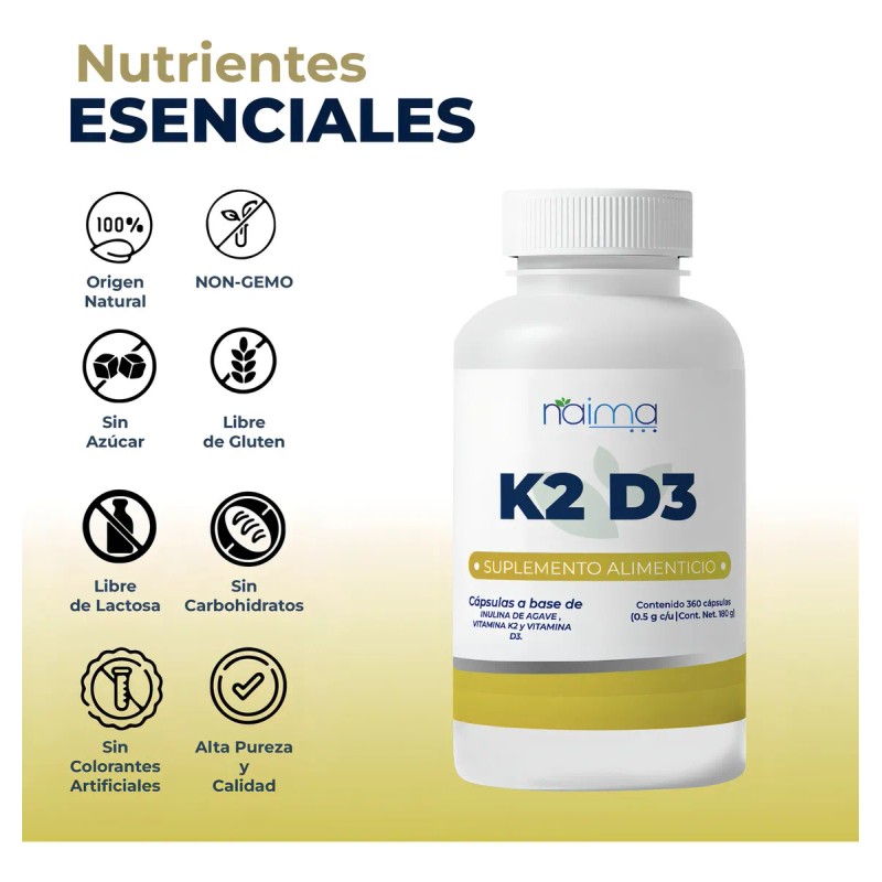 Vitamina D3, Vitamina K2, K2D3, 360 cápsulas, calcio, huesos, dientes, salud cardiovascular, sistema inmune, absorción calcio, bienestar, suplemento, alta potencia, soporte óseo.