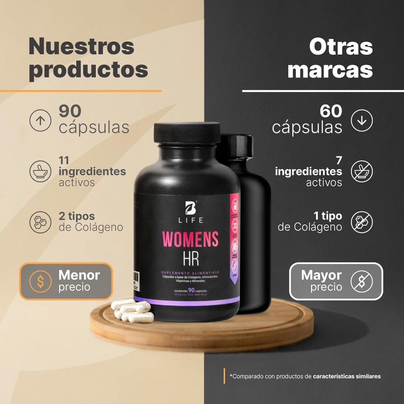 ¡Fuerza y brillo con Womens Hair B Life! Cada cápsula de 500 mg contiene Colágeno Hidrolizado tipo 1 y 3, L-Cisteina, L-Lisina, L-Metionina, Ácido Hialurónico, Zinc, Biotina, Selenio, Vitaminas C y A. Una valiosa sinergia de proteínas y aminoácidos valiosos para tu cabello, ausentes en otras presentaciones. Contiene 90 cápsulas.