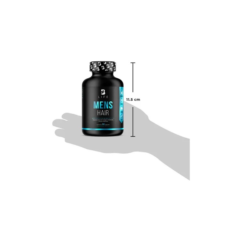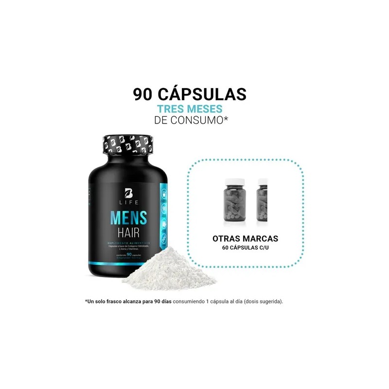 Disfruta la formulación de Mens Hair B Life. Cada cápsula de 500 mg está diseñada para aportar 340 mg de Colágeno y 100 mg de L-lisina, componentes que forman parte de la estructura del cabello. Enriquecida con Zinc, Vitaminas B5, B6, A, D3 y Biotina, activos valiosos que complementan la fórmula. Contiene 90 cápsulas.
