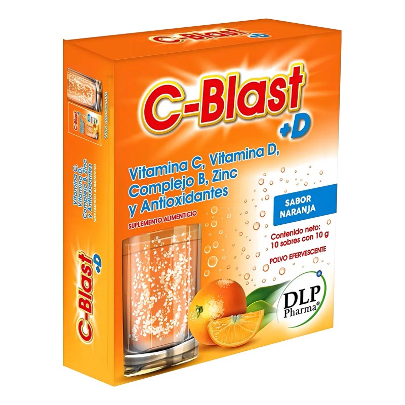 C-Blast+D de DLP Pharma es un suplemento nutricional único que combina el poder del Complejo B con vitales antioxidantes, proporcionando un impulso significativo a tu bienestar diario. Presentado en un práctico formato de polvo efervescente, cada sobre ofrece un delicioso sabor a naranja, convirtiendo tu rutina de suplementación en una experiencia placentera.