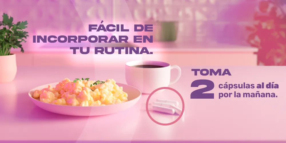 - Fácil de incorporar en la rutina, con 2 cápsulas diarias en el desayuno y 60 cápsulas por frasco para 30 días de uso.