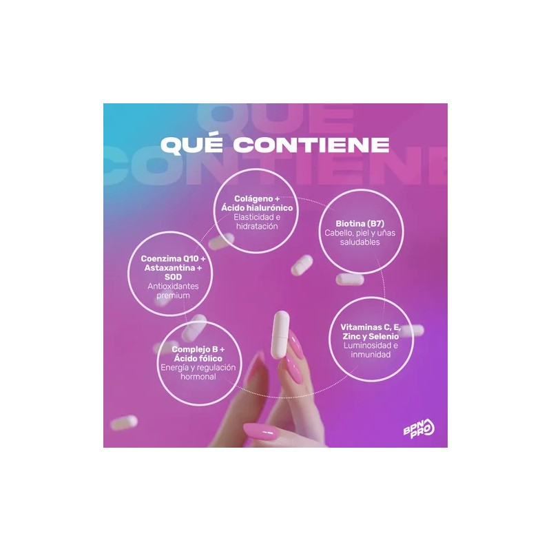 - Fórmula completa con ingredientes esenciales para el cuidado de la piel, cabello y uñas.