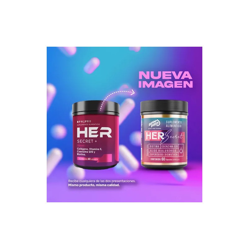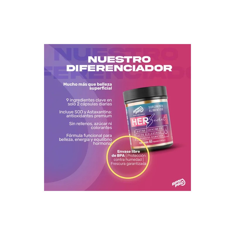 Apoya la salud de la piel, cabello y uñas con Her Secret BPN PRO. Esta fórmula avanzada está diseñada para mujeres que buscan mejorar su bienestar general y fortalecer su belleza desde el interior. Con una mezcla única de ingredientes esenciales como biotina, colágeno, ácido hialurónico, Coenzima Q10, Superóxido Dismutasa (SOD) y vitaminas, esta fórmula se convierte en el aliado ideal para lograr una piel más firme, cabello más fuerte y uñas saludables.