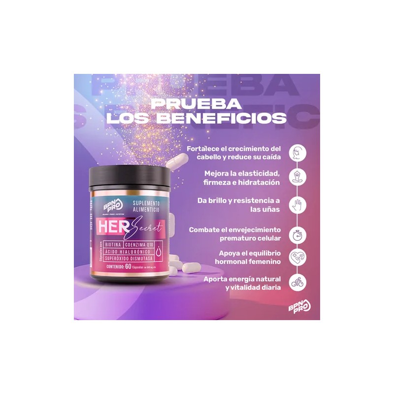 Vitaminas Mujer Fortalece Cabello Piel Uñas Biotina Colágeno Ácido Hialurónico Coenzima Q10 Superóxido Dismutasa Apoya Energía y Bienestar Femenino Her Secret BPN PRO 60 Cápsulas