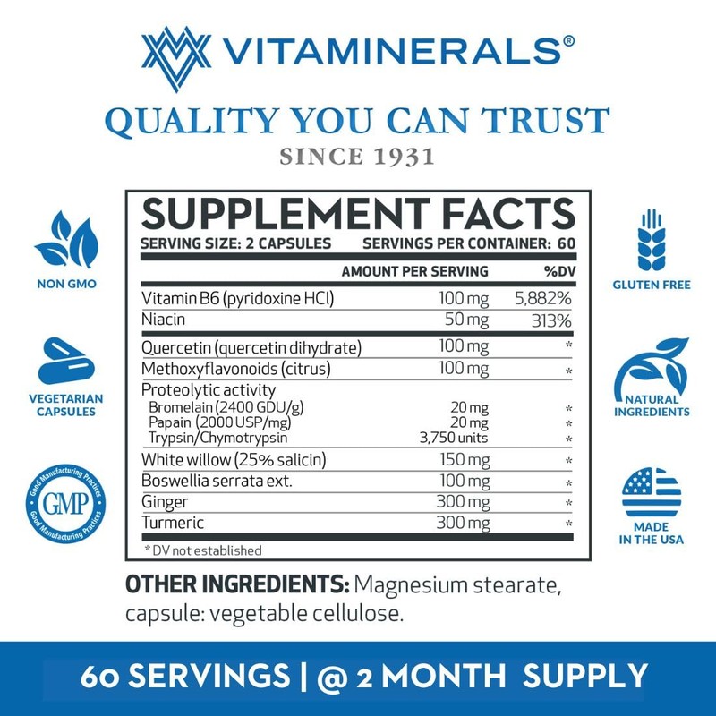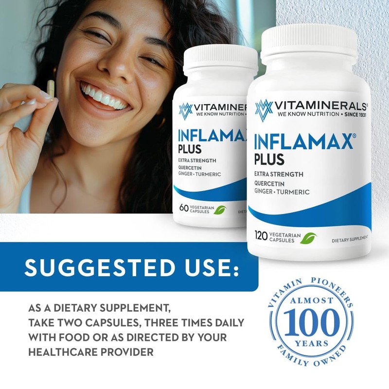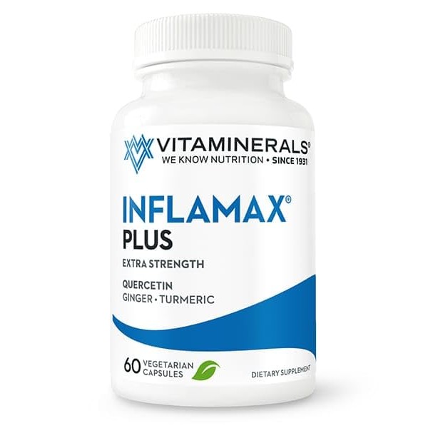 Vitaminerals' Inflammax Plus is an All-Natural formula containing Vitamin Bb, Niacin, QUERCITIN, Methoxy Flavonoids, Bromelain, Papain, Trypsin/Chymotrypsin, White Willow ext., Boswellia serrata, Ginger, Turmeric. Veggie Capsules